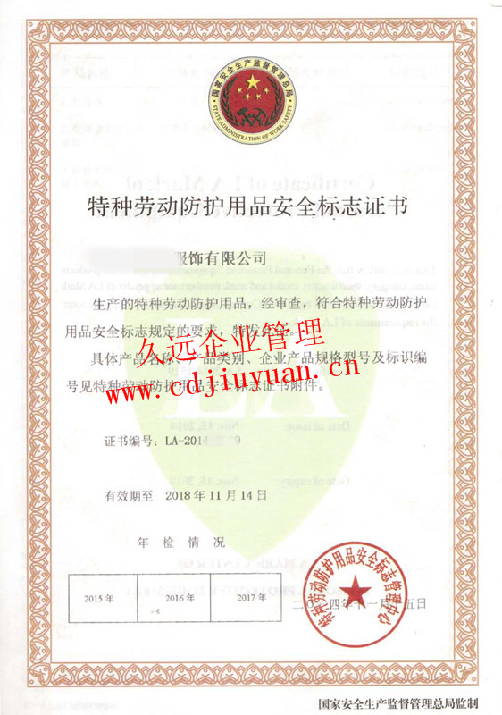 勞動防護用品安全標志認證證書