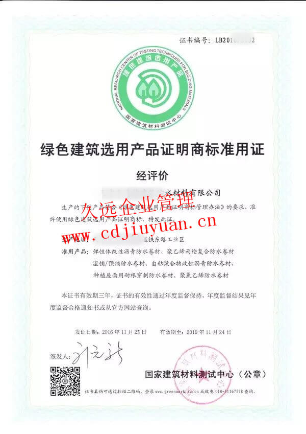 綠色建筑選用產品認證證書