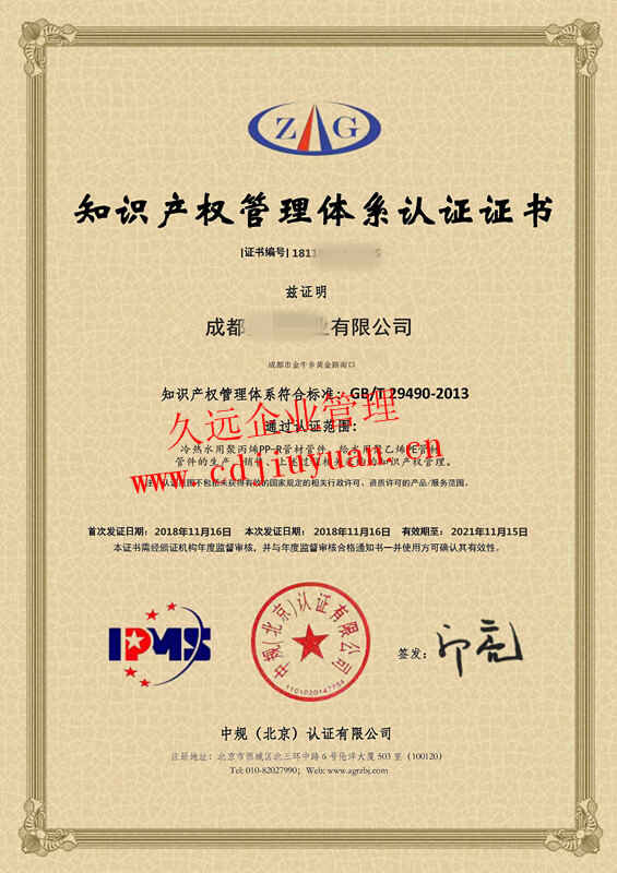 知識產權管理體系認證證書